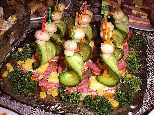 Очень необычные и запоминающиеся канапе можно сделать из совершенно обычного набора продуктов. На кусочек хлеба нанести сливочный сыр. Из огурца вырезать «тельце» улитки по форме напоминающее запятую. Тонкий и длинный кусочек красной рыбы сложить вдоль пополам, положить тонкий кусочек сыра и завернуть спираль — раковину. Надеть на шпажку спираль, затем «тельце» из огурца и воткнуть шпажку в хлеб со сливочным сыром. Теперь добавить детали. Из болгарского перца можно вырезать зонтик и нанизать его сверху на шпажку. Из кусочка перца или помидора вырезать крохотную полосочку — ротик и приклеить сливочным сыром, глазки — горошины перца — также закрепить сыром.