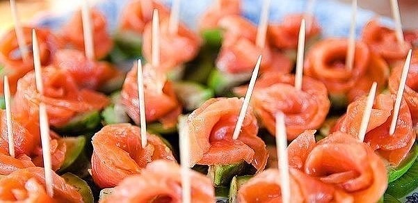 Для приготовления этих «романтичных» канапе понадобится слабосоленая или копченая рыба, нарезанная тонкими пластами, сливочный сыр и хлеб, например, багет. Хлеб нарезать на кусочки толщиной до 0,5 см. Если вы не нашли багет, то можно из кусочков обычного батона вырезать кружочки вырубкой для печенья. На хлеб нанести слегка подсоленный сливочный сыр. Кроме того, в сыр можно добавить мелко нарезанную зелень. Тонкий длинный кусочек рыбы свернуть спиралью и установить вертикально на сыр. Нежные, вкусные и очень красивые канапе готовы.