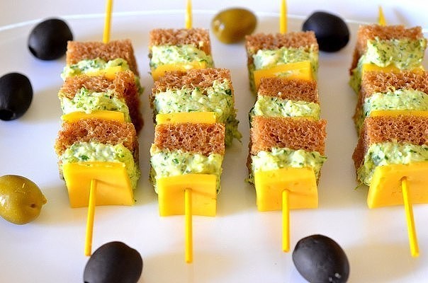 Очень эффектно смотрятся многослойные канапе. Несмотря на длинное описание, готовятся они очень просто. Нарезать одинаковые по толщине куски черного и белого хлеба. Лучше брать «кирпичик», чтоб куски были квадратной или прямоугольной формы. Кусок черного хлеба намазать сливочным сыром, выложить тонко нарезанные огурцы и посолить. Белый кусок хлеба смазать сливочным сыром и выложить смазанной стороной на огурцы. Теперь смазать сливочным сыром верх белого куска, на него выложить рыбу, накрыть смазанным куском черного хлеба. И повторить действия, прослоив, например, тонкими кусочками болгарского перца или помидора. Завершить куском белого хлеба. Сборка чем-то напоминает сборку торта. Воткнуть шпажки в многослойный бутерброд на одинаковом расстоянии. Между шпажками разрезать бутерброд накрест на квадратики, на каждой шпажке остается многослойное квадратное канапе.
