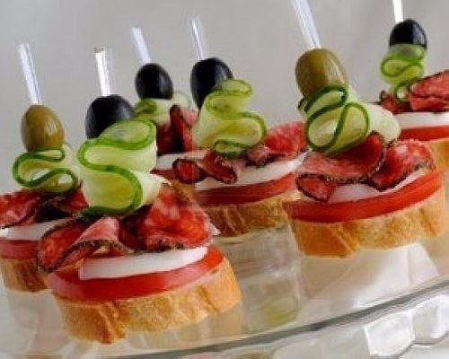 Очень эффектно смотрятся объемные волнистые канапе. На кусочек хлеба выложить кусочек помидора и сыра. Надеть на шпажку тонко нарезанную колбасу, полоски огурца, воткнуть шпажку в основание. Завершить можно половинкой оливки. Вместо колбасы волной можно нанизать тонко нарезанный сыр.
