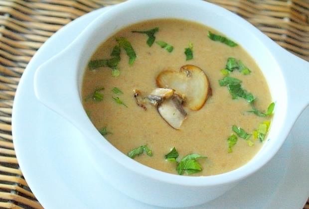 3. Картофель и грибы взбить блендером до однородной массы, вмешать заправку и 1 стакан отвара от картофеля и грибов. Еще раз хорошо перемешать. Добавить перец молотый по вкусу.