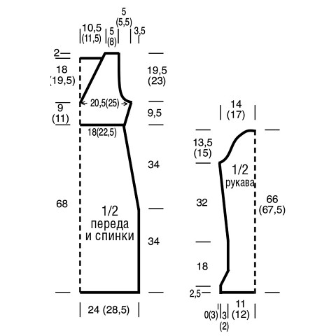 Вязать, как спинку, но с V-образным вырезом. Для этого через 9 см = 28 р. (11 см = 34 р.) от окончания чередования узоров работу разделить посередине и для скосов по внутреннему краю * подчеркнуто убавить в каждом 2-м р. 2 х 1 п. и в следующем 4-м р. 1 х 1 п., от * повторить подчеркнутые убавки 6 раз, затем в каждом следующем 2-м р. подчеркнуто убавить еще 1 (3) х 1 п. Оставшиеся 11 (17) п. плеч закрыть на высоте спинки.