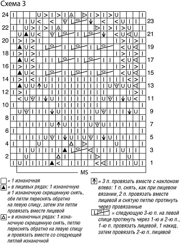 Число петель кратно 20 + 1 + 2 кромочные. Вязать по приведенной схеме 3. На схеме даны лицевые и изнаночные ряды. Начать с 1 кромочной, постоянно повторять раппорт, закончить петлей после раппорта и 1 кромочной. В высоту повторять 1–24-й р.