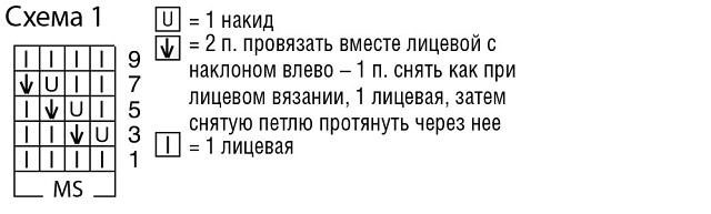Число петель кратно 4 + 2 кромочные. Вязать по приведенной схеме 1. На схеме даны только лицевые ряды, в изнаночных рядах петли и накиды вязать изнаночными. Между кромочными постоянно повторять раппорт. В высоту постоянно повторять 1–10-й р.