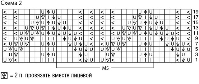 Число петель кратно 18 + 17 + 2 кромочные. Вязать по приведенной схеме 2. На схеме даны только лицевые ряды, в изнаночных рядах петли вязать согласно узору, лицевые скрещенные вязать изнаночными скрещенными, накиды вязать изнаночными. Начать с 1 кромочной и петель перед раппортом, постоянно повторять раппорт, закончить петлями после раппорта и 1 кромочной. В высоту повторять 1–20-й р.