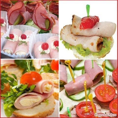Если колбасу, ветчину или буженину нарезать очень тонко, ее можно свернуть в трубочку, сложить гармошкой и приколоть шпажкой