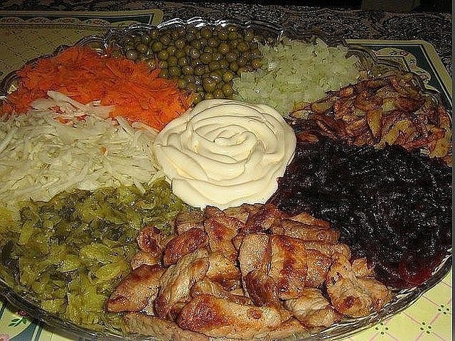 Все продукты выложить на блюдо в равных пропорциях, в центр — майонез.