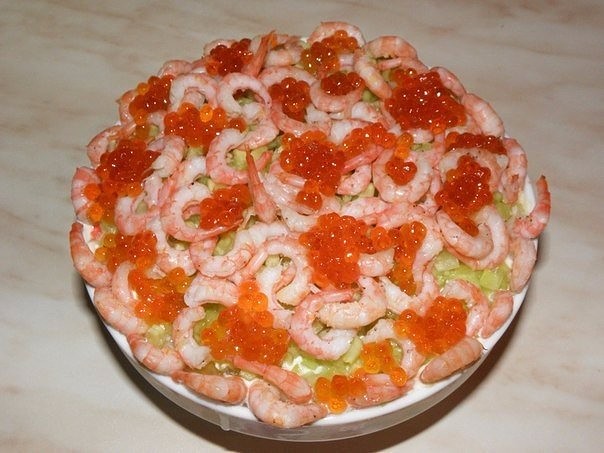 4 слой: отваренные и мелко нарезанные кальмары и креветки, смешанные с 2-3 ст. л. майонеза.