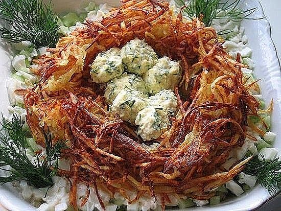 Выложить на блюдо, сделать в центре углубление и придать форму гнезда.