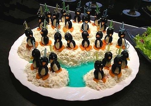 Оформляется салат с языком «Пингвины на льдине» так: пингвинчиков поставить на «айсберг» в произвольном порядке, перед подачей охладить.