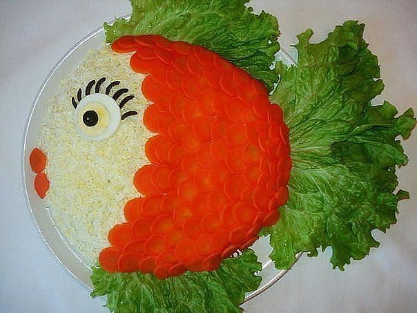 Выкладывать салат золотая рыбка слоями, каждый слой промазывая майонезом.
